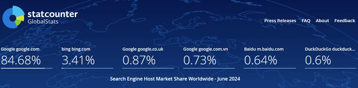 Bizonyára sokat hallod ezt a kifejezést: megkeresem a gugliban, kiguglizom, Google optimalizáció, Google így, Google úgy… stb. Igen, ma már csak a Google. Régebben foglalkoztunk a többiekkel is (Bing, Yahoo, DuckDuckGo, és egyéb keresők) Azonban mára a Google szinte teljesen kiütötte őket. Nézd, ez a kép mindent elárul: